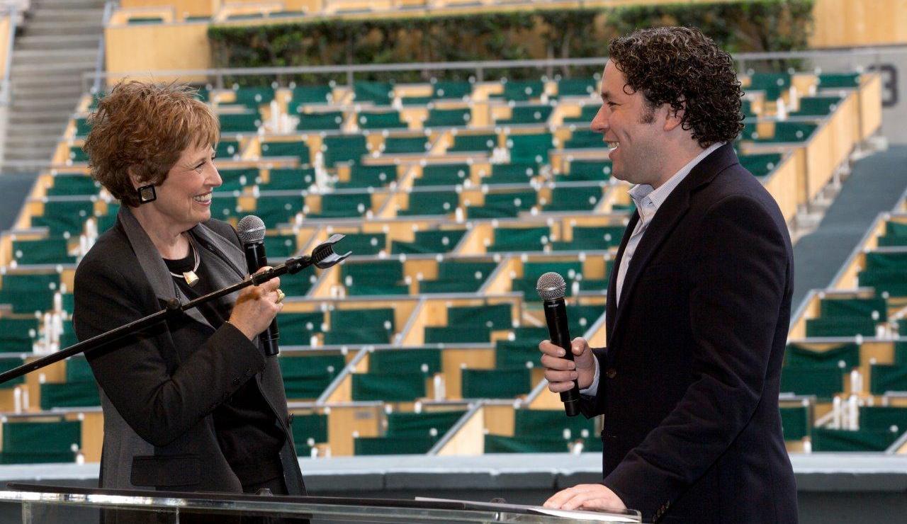 Deborah Borda, presidente de la Filarmónica de LA, junto a su director musical, Gustavo Dudamel, en la presentación de la temporada del Hollywood Bowl. Crédito: Matthew Imaging