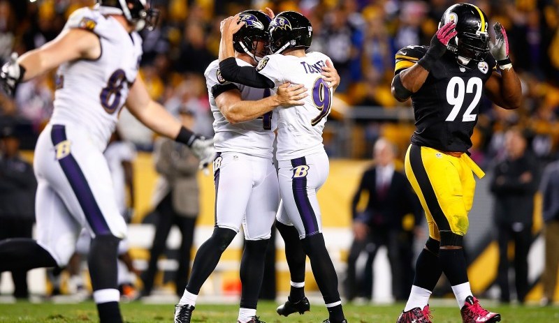 El pateador de los Ravens Justin Tucker es felicitado tras patear el gol de campo decisivo de otra emocionante batalla contra los Steelers. Crédito: Getty Images