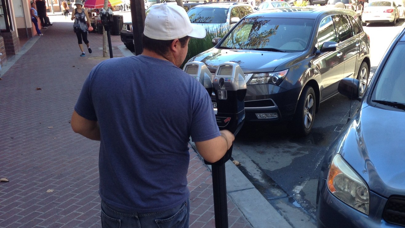 Un inmigrante pone monedas en un parquímetro en la Calle Cuarta de Santa Ana