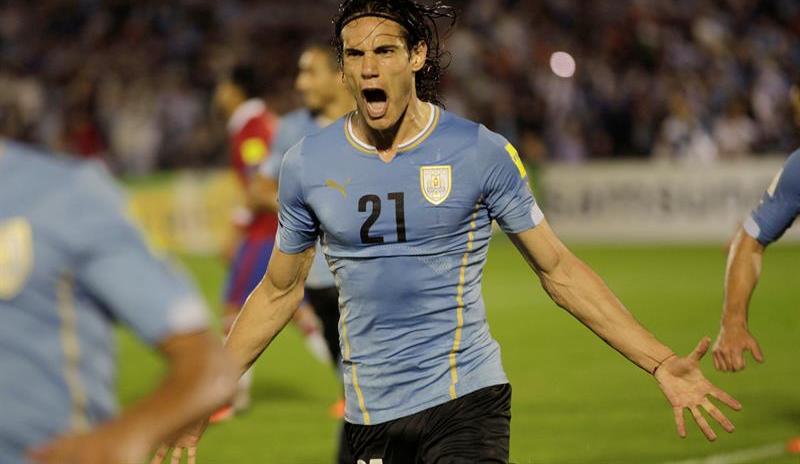 El jugador de Uruguay Edinson Cavani celebra el gol de su compañero Diego Godín. Crédito: EFE