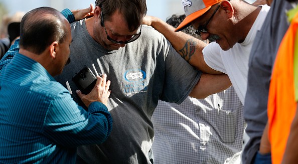 Un grupo de hombres se abrazan afuera del Inland Resource Center en San Bernardino, donde una pareja armada ultimó a 14 personas e hirió a muchas más. (Getty Images) Crédito: Getty Images
