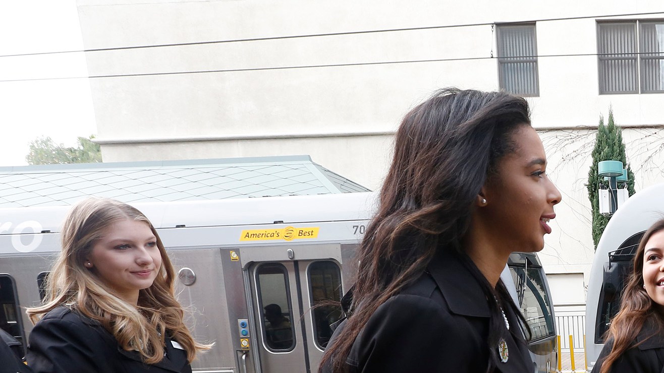 La Reina del Desfile de las Rosas y su corte viajan en la Línea Dorada de Metro en Pasadena. Crédito: Aurelia Ventura | La Opinión