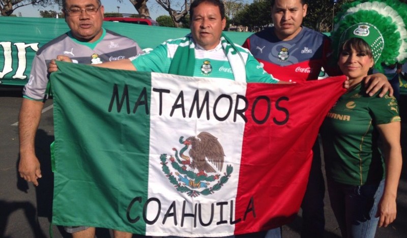 Carlos Caustrita (centro) viajó durante 18 horas desde la Comarca Lagunera para el juego de su Santos contra el Galaxy en la Concachampions. Crédito: Abraham Nudelstejer