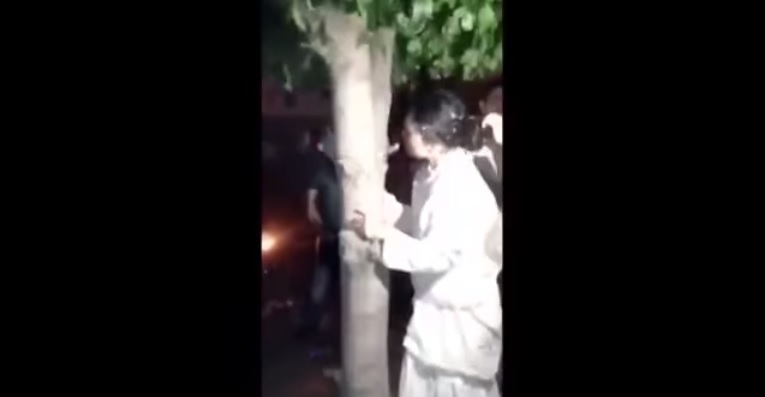 La mujer sigue de blanco ahora está lamiendo un árbol.
