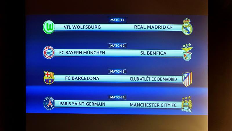 El Real Madrid y el Bayern Múnich fueron los más afortunados del sorteo de los cuartos de final de la Champions League y se enfrentarán al Wolfsburgo y al Benfica, respectivamente, para disfrutar de un regalo que no tendrán el Barcelona y el Atlético de Madrid, protagonistas del duelo fratricida de la antepenúltima ronda de la competición.