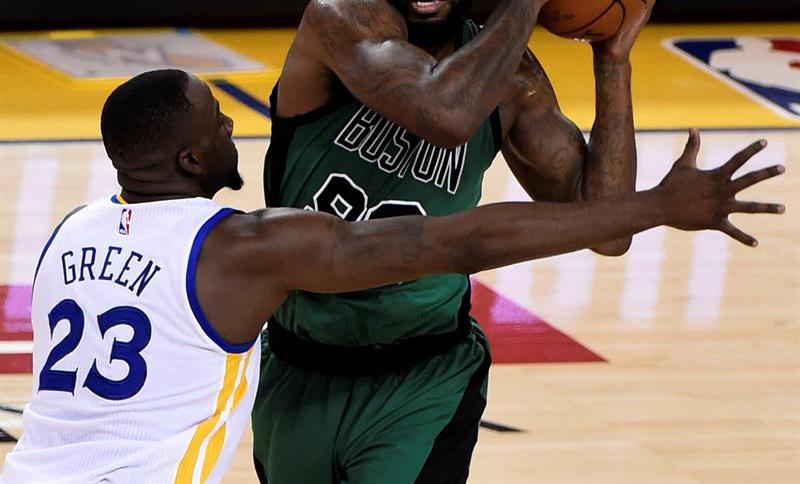 Amir Johnson, de Celtics de Boston, disputa el esférico con Draymond Green, de los Warriors del Golden State. Crédito: EFE