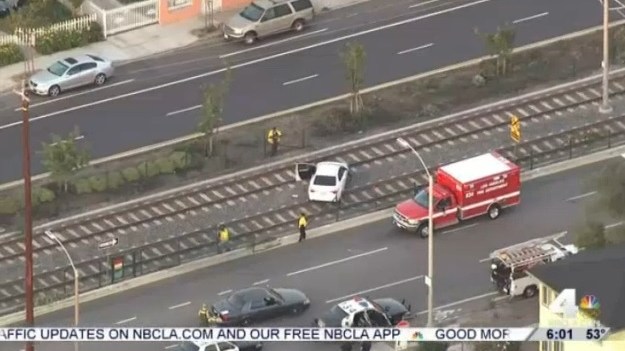 A car is on the tracks of the Expo Line, which had just been expanded on Friday: https://t.co/lbvCdOKnUW pic.twitter.com/Outv95Uwev