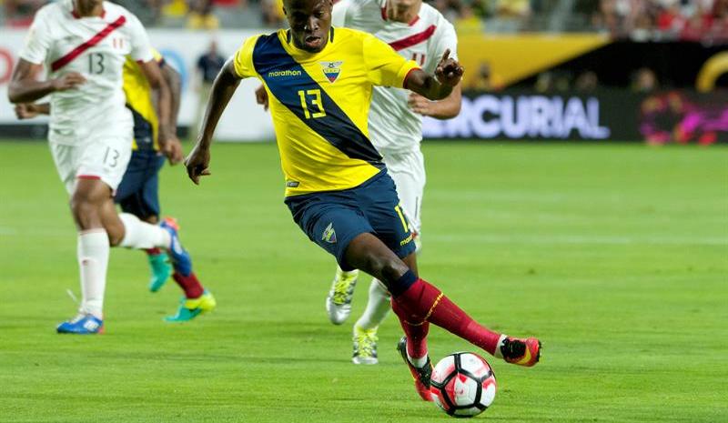 Enner Valencia conduce el balón en el juego contra Perú en Phoenix. Crédito: EFE