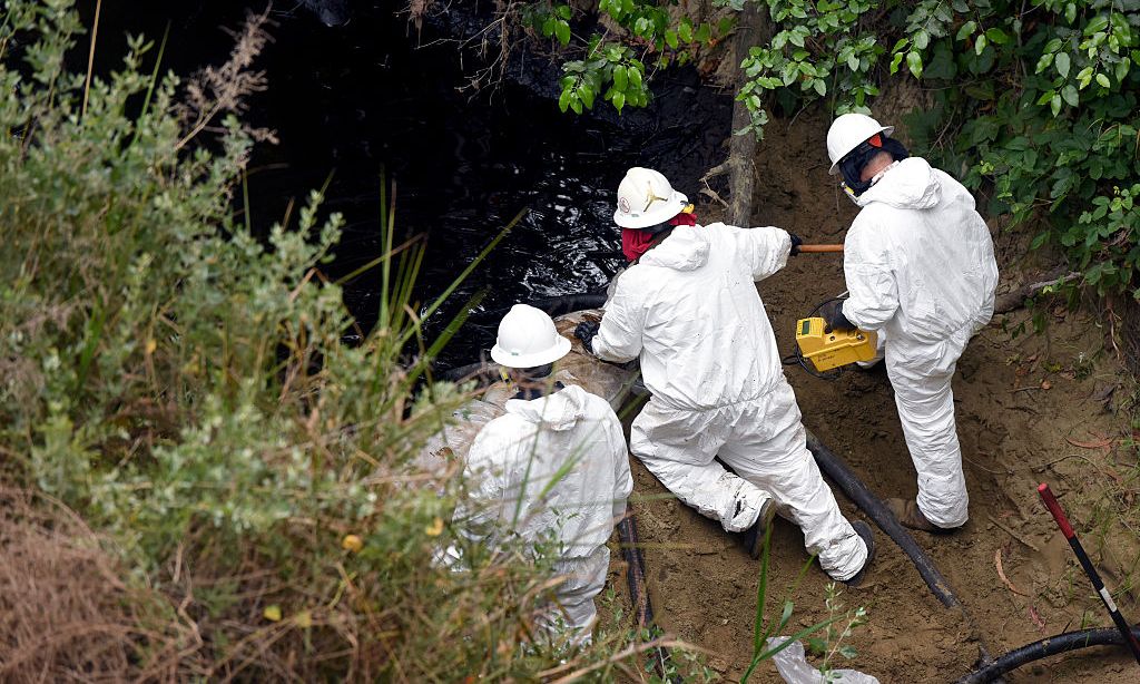 Un equipo de limpieza trabaja en el derrame de 700 barriles de petróleo en Ventura, California. Crédito: MICHAEL OWEN BAKER | Getty Images