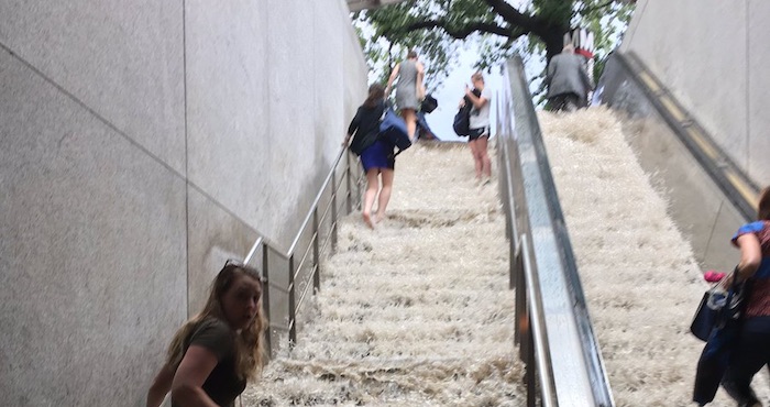 Las fuertes lluvias registradas el pasado miércoles en la ciudad de Washington D.C. ocasionaron que las escaleras de varias estaciones del metro se convirtieran en cascadas.