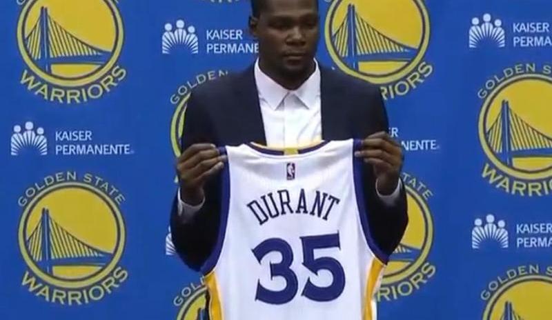 Kevin Durant y su nuevo jersey con los Warriors de Golden State Crédito: Especial
