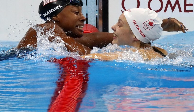 La nadadora estadounidense Simone Manuel y la canadiense Penny Oleksiak compartieron el oro en la final de los 100 libre de los Juegos Olímpicos de Río tras firmar un idéntico crono de 52.70, nuevo récord olímpico.