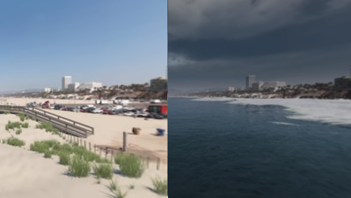Un antes y supuesto después de cómo afectaría el cambio a nuestra costa de California. Crédito: Captura/YouTube