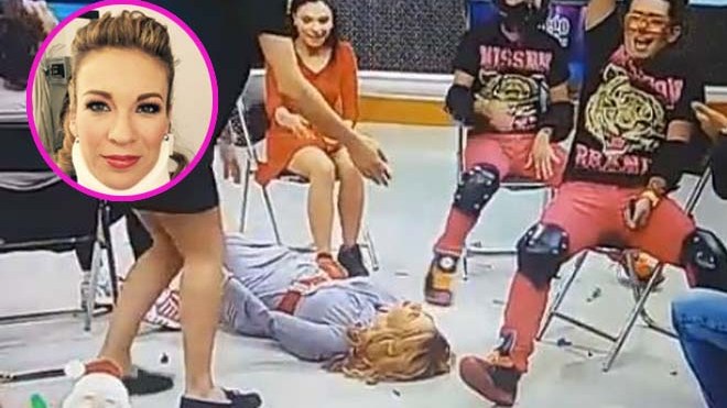 Fue el pasado lunes cuando uno de ‘Los Destrampados’ le hizo una mala jugada y jaló la silla donde estaba sentada, por lo que la conductora e inmediatamente cayó de sentón, lastimándose el cuello.