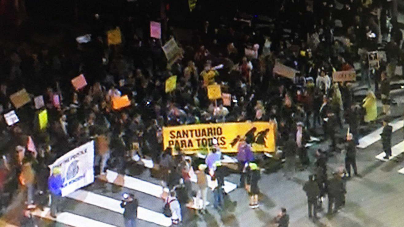 Pero después del evento, otro centenar de personas inundaron las calles, marchando hasta llegar a la rampa de entrada a la autopista 101, y adentrándose a los carriles viales hacia el sur hasta bloquear el paso por completo.