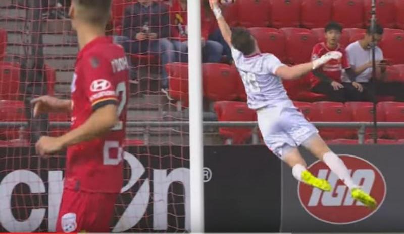 John Hall chocó su rostro contra el palo luego de protagonizar una atajada espectacular en la Liga de Australia; su equipo, Adelaide United, ganó 1 a 0
