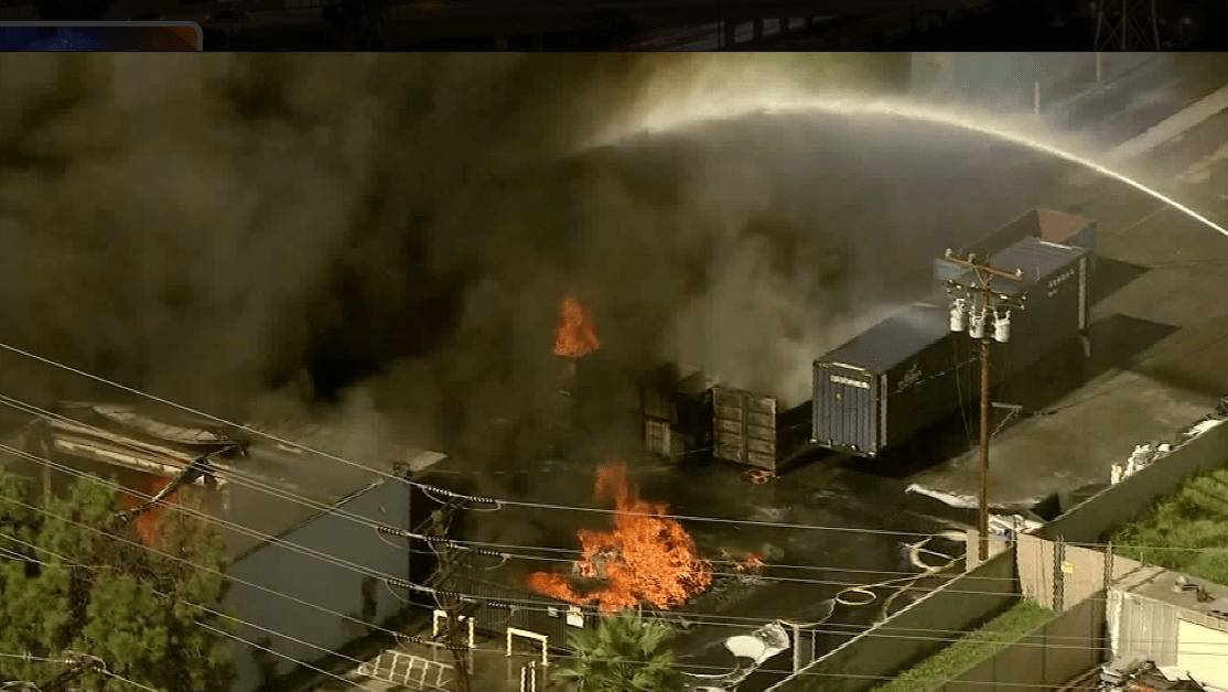 Un edificio comercial y un patio lleno de contenedores de transporte parecía estar ardiendo. A las 3:30 p.m., el edificio parecía destruido, así puede verse en el video aéreo que Sky5 logró captar.
