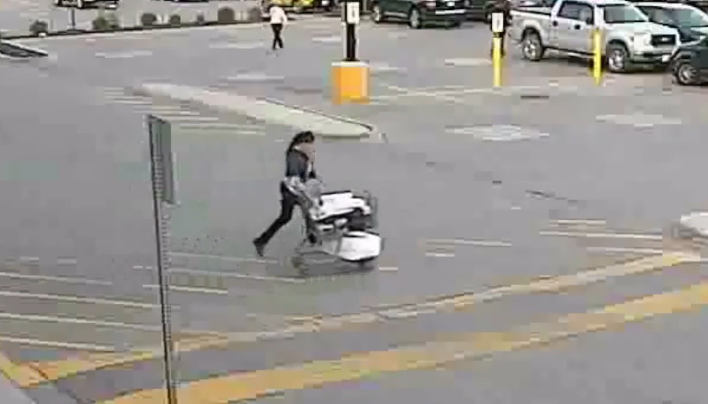 Un video de vigilancia de un Walmart en Ontario muestra a una mujer correr hacia el estacionamiento mientras empuja un carro de compras repleto de mercancía. Un trabajador la persigue pero no necesitó mayor esfuerzo ya que la sospechosa tropieza y cae de narices sobre el pavimento.
