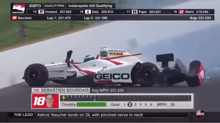 Bourdais, que acababa de ingresar en la pista en busca de su mejor tiempo de clasificación y marcaba el mejor crono de la jornada, perdió el control de su coche y de la trayectoria en la entrada a una curva y se estrelló contra un muro a una velocidad de 372 km/h.