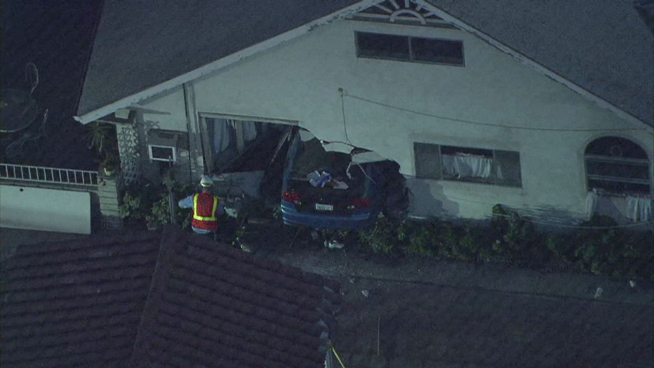 Imagen que muestra el estado en que quedó el auto dentro de la vivienda. Crédito: captura de pantalla de abc7