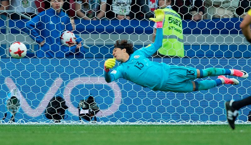 El vuelo del portero mexicano Guillermo Ochoa tras un remate de Cristiano Ronaldo en el primer partido del Grupo A de la Copa Confederaciones entre Portugal y México. Crédito: Etzel Espinosa | Imago7