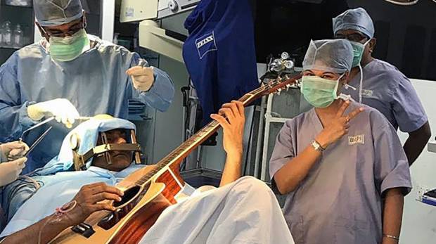Paciente toca la guitarra mientras le operan el cerebro Crédito: AFP