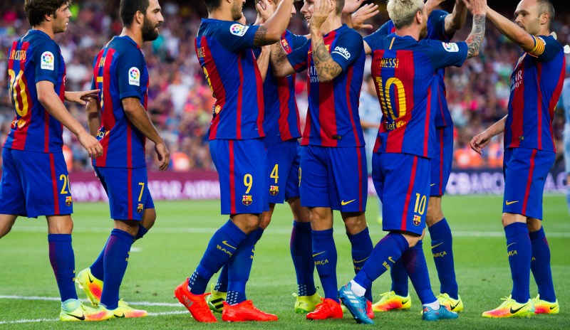 Sergi Roberto, Arda Turan, Luis Suarez, Ivan Rakitic, Lionel Messi, Sergio Busquets y Andres Iniesta felicitan al francés Lucas Digne, durante un juego del FC Barcelona. Alex Caparros/Getty Images