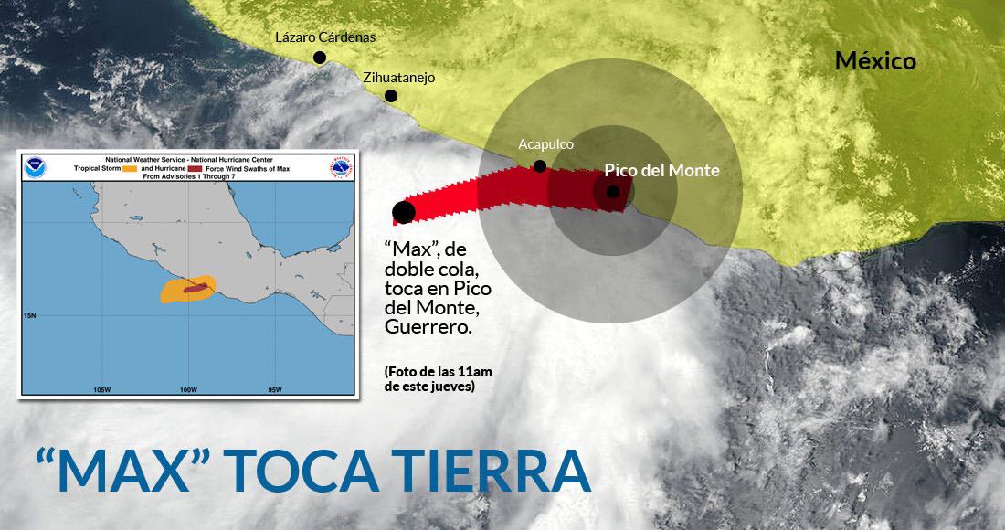 Guerrero/Ciudad de México – El ojo del huracán “Max”, de categoría 1, tocó tierra hoy en el poblado de Pico del Monte, en el estado de Guerrero, donde está causando tormentas fuertes, informó el Servicio Meteorológico Nacional (SMN).