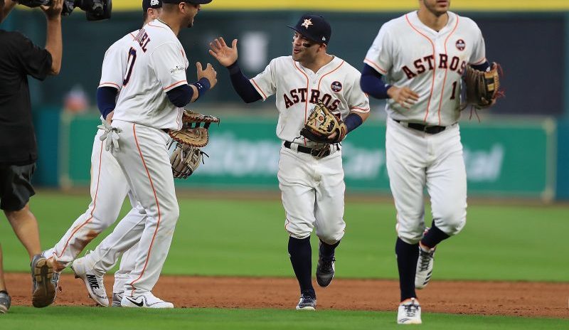 Jose Altuve celebra con sus compañeros de los Houston Astros el triunfo de 8-2 sobre los Boston Red Sox en la Serie Divisional de la Liga Americana. Crédito: Ronald Martinez | Getty Images