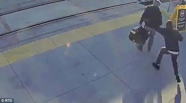 Pero justo detrás de él, un hombre salta sobre el hombre para salvarlo.. Lo atrapa por la parte trasera de su abrigo justo antes de que él se vaya a las vías.