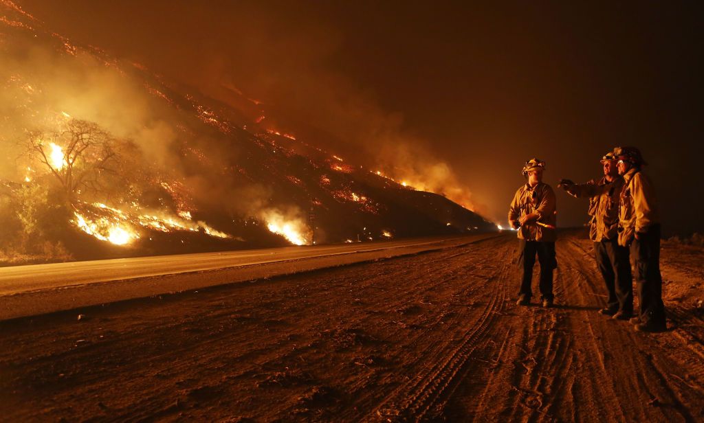 Bomberos vigilan el fuego a lo largo de la autopista 101 en el condado de Ventura.  Getty Images