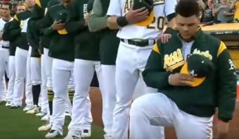 El momento en que Bruce Maxwell de los Atléticos de Oakland se arrodilla durante el himno. Crédito: Tomada de la TV