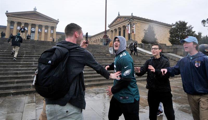 Aficionados en la escalinata del Philadelphia Museum of Art antes del Super Bowl LII entre los Philadelphia Eagles y los New England Patriots. (Foto: EFE/EPA/BASTIAAN SLABBERS)  Crédito: BASTIAAN SLABBERS | EFE/EPA