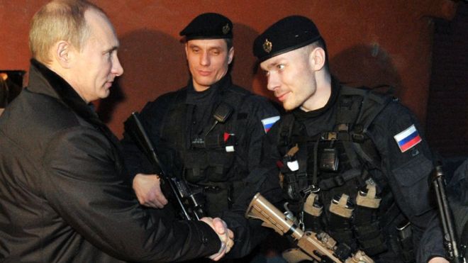 El presidente Vladimir Putin se reunió con las fuerzas especiales del FSB en Chechenia en 2011. Crédito: Getty