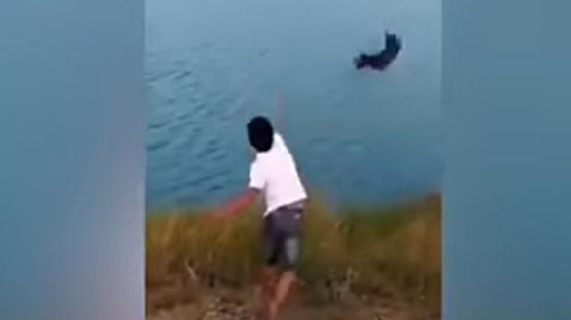 En el video que circula en internet se observa como el sujeto arroja a un cachorroal lago, donde el animal trata de nadar hasta la orilla, pero no puede y se hunde en varias ocasiones, pero en uno de sus intentos de seguir nadando es devorado por un cocodrilo.