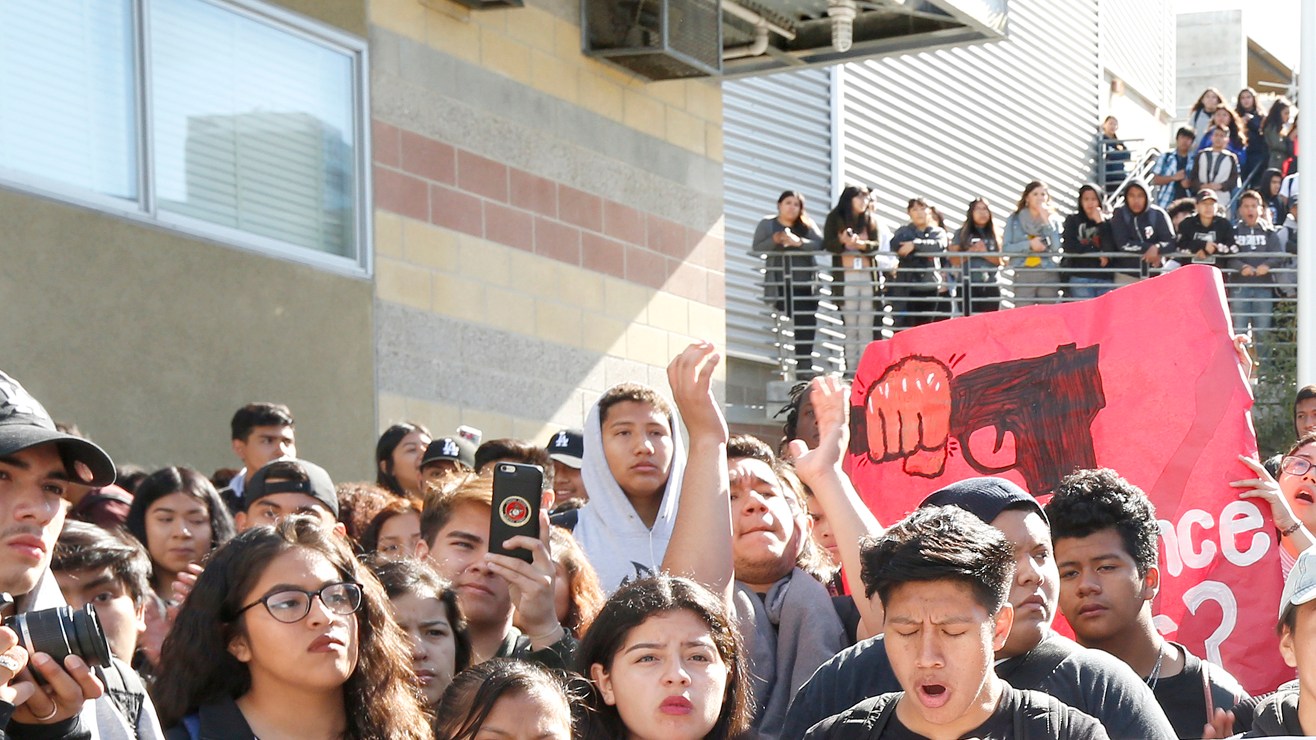 Alumnos de la escuela Miguel Contreras se sumaron a las acciones contra la violencia por las armas y decidieron dejar sus aulas por algunos minutos. (Photo Aurelia Ventura/La Opinion)