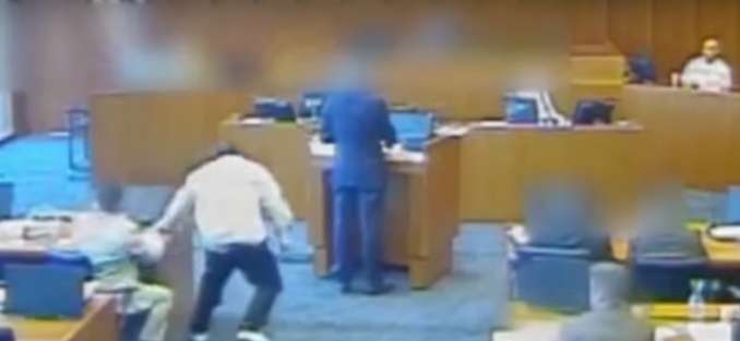 En cuestión de segundos, la aparente calma da paso al caos en la sala del tribunal de Salt Lake City, en Utah. El acusado se levanta de su asiento, agarra el bolígrafo de su abogado y corre hacia su rival para atacarle.