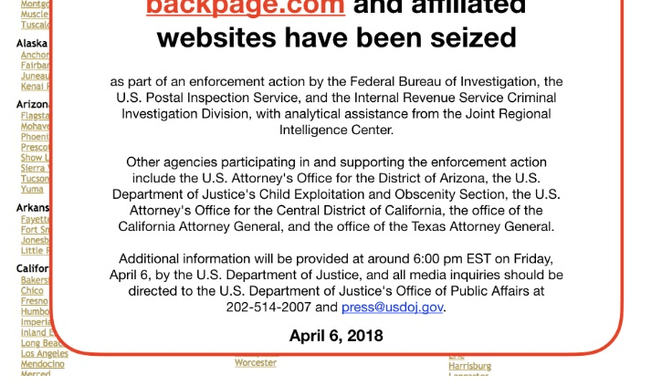 La decisión se dio a conocer un día después de que Donald Trump firmara la ley contra el tráfico sexual. Esa legislación, que cuenta con un amplio respaldo bipartidista en el Congreso, brinda a los fiscales más herramientas y suspende las protecciones de responsabilidad para las compañías de Internet cuyos sitios alojan contenido ilegal.