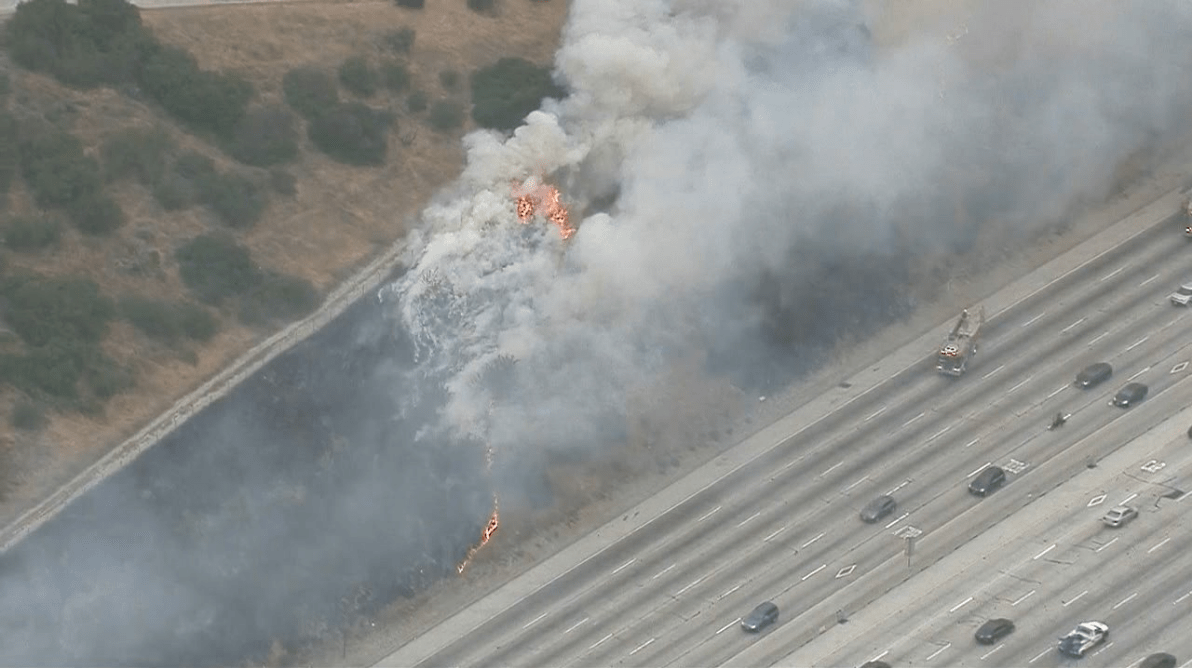 El incendio quemó hierba a lo largo de la autopista 405. Crédito: Kevin Takumi (Twitter)