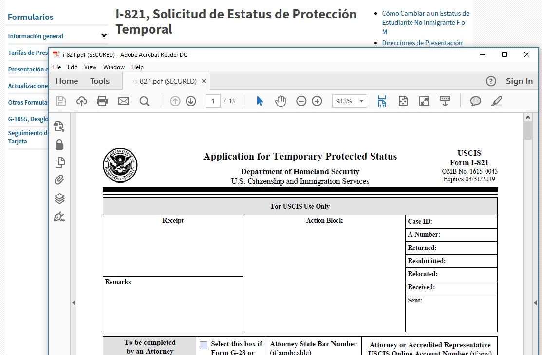 “Todos los solicitantes deben presentar el Formulario I-821, Solicitud al Estatus de Protección Temporal”, apuntó la autoridad en un comunicado. “También pueden pedir un Documento de Autorización de Empleo (EAD) por medio de la presentación del Formulario I-765, Solicitud de Autorización de Empleo”.