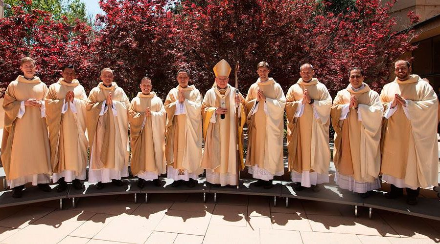Jose Gomez, arzobispo de L.A., rodeado de sacerdotes. Crédito: infancia misionera (twitter)