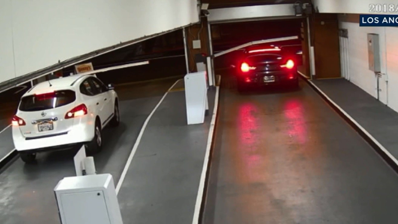 El video de vigilancia muestra al sospechoso teniendo problemas para salir de la estructura de estacionamiento en la cuadra 800 de la calle S. Figueroa en el centro de Los Ángeles el 9 de junio alrededor de las 11:30 p.m. La puerta no lo deja salir, no quedando claro el motivo.