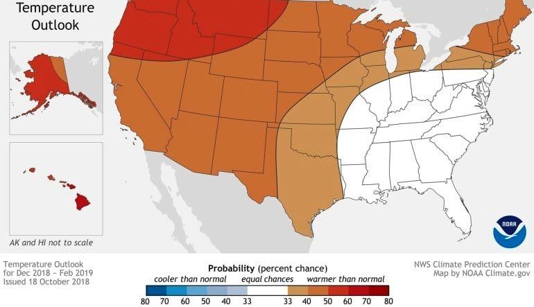 Según el informe estacional anunciado ayer, los estados del Pacífico Noroeste a través de los llanos del Norte y el Noreste tendrán temperaturas superiores a la media y ninguna parte del país debería ver un invierno más frío de lo normal.