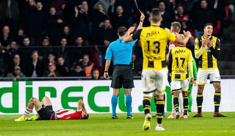 El mexicano Hirving Lozano yace en el césped mientras Danilho Doekhi del Vitesse es expulsado. (Foto: EFE/EPA/THOMAS BAKKER) Crédito: THOMAS BAKKER | EFE/EPA