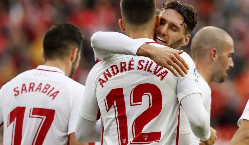 El delantero del Sevilla André Silva celebra su gol al Valladolid en el estadio Sánchez Pizjuan. Crédito: Jose Manuel Vidal | EFE