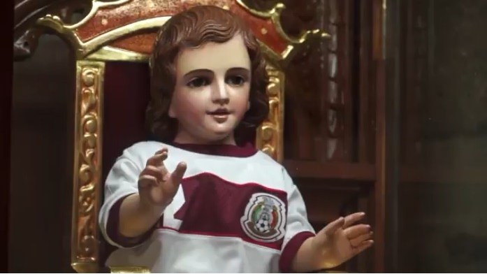 Feligreses acostumbran a vestir al Niño Jesús con playeras de fútbol Crédito: Captura Youtube