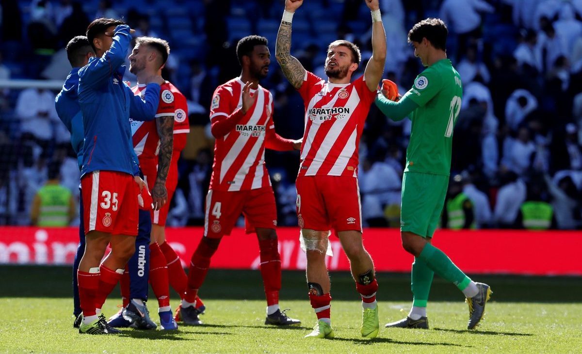 Los jugadores del Girona celebran la victoria de su equipo ante el Real Madrid.