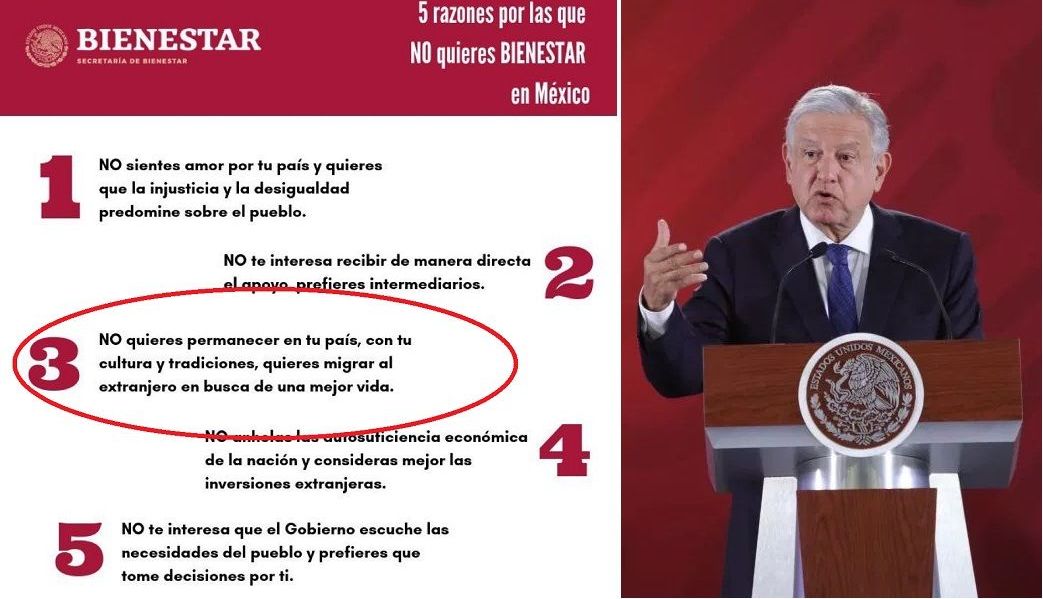 “NO quieres permanecer en tu país, con tu cultura y tradiciones, quieres migrar al extranjero a buscar una mejor vida”, dice el mensaje publicado el domingo, como parte de una lista titulada “5 razones por las que NO quieres BIENESTAR en México”.