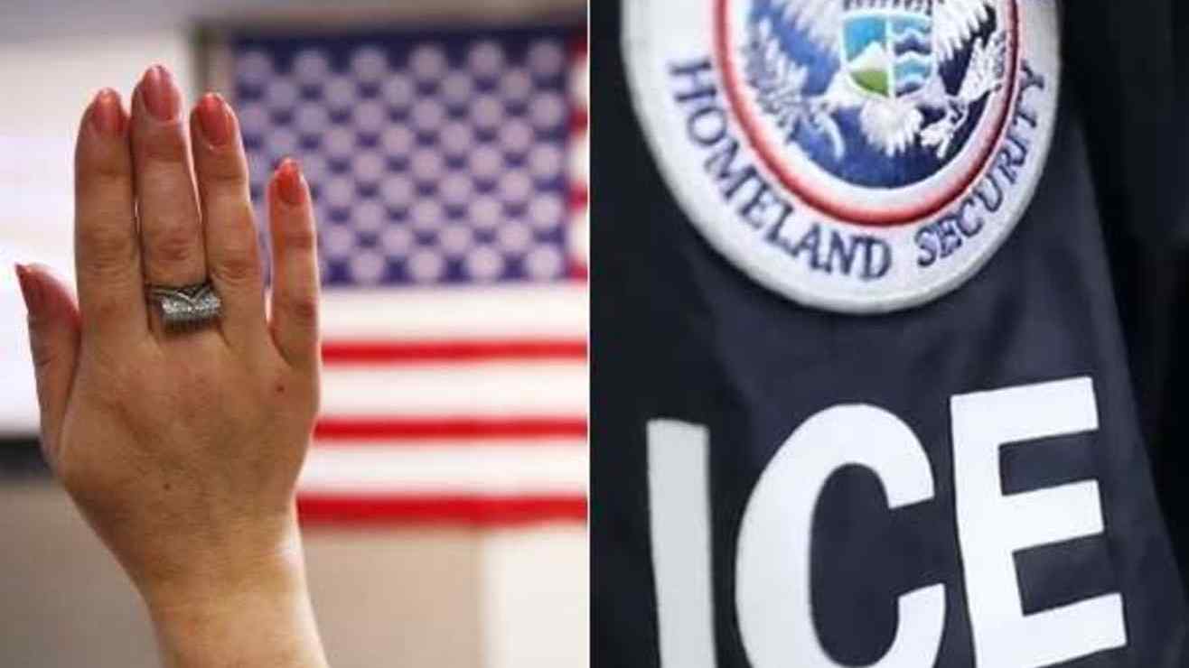 Imágenes de archivo de un proceso de naturalización y de una insignia de ICE. Crédito: (Getty Images / ICE)