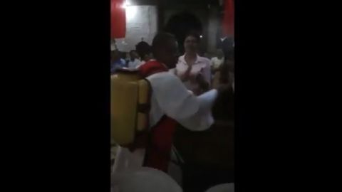 Resulta ser que en el video se aprecia al sacerdote, quien lleva un fumigador en la espalda y con el cual rocía el agua bendita a los feligreses.